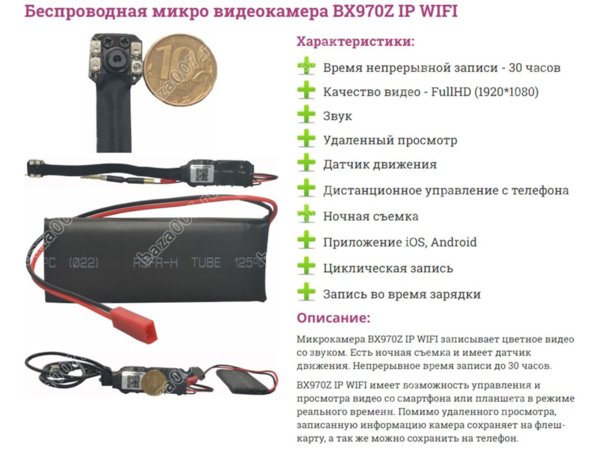 | Беспроводная Мини WIFI видеокамера BX970Z | Пишет видео и звук на карту памяти SD транслирует видео по WIFI. Сигнал может приниматься напрямую по WIFI, либо передаваться по интернет. Работает без подзарядки около 12ч. Пишет видео при зарядке АБ. |